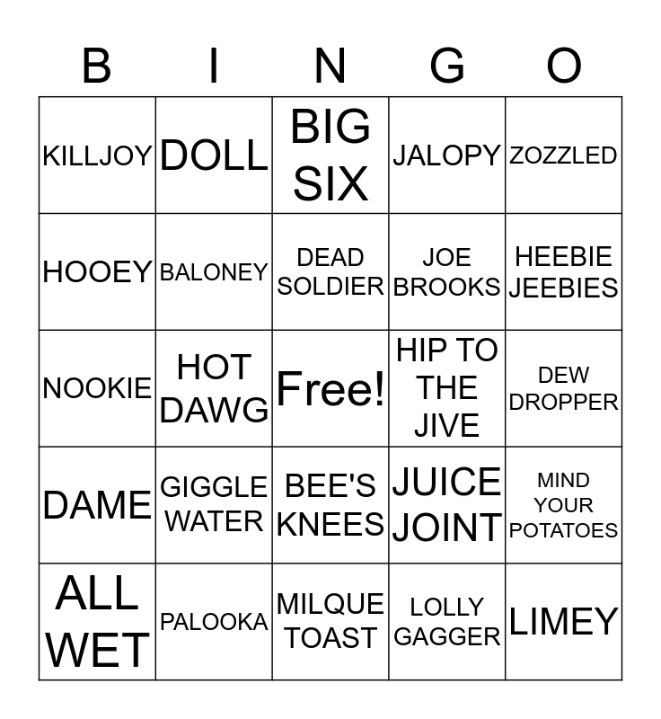 This bingo card has a free space and 44 words: ATTABOY, GIGGLE WATER, RAGA MUFFIN, LOLLY GAGGER, SPEAK EASY, KEEN, BALONEY, VAMP, JALOPY, LIMEY, KILLJOY, PALOOKA, JUICE JOINT, DEW DROPPER, BEESWAX, HAY BURNER, MILQUE TOAST, HIP TO THE JIVE, LIVE WIRE, NOOKIE, DOLL, BEE'S KNEES, FOUR FLUSHER, ZOZZLED, BOOTLEG, GAMS, DEAD SOLDIER, BEESWAX, MIND YOUR POTATOES, ALL WET, BALLED UP, BIG SIX, BREEZER, BUG EYED BETTY, DAME, DUMB DORA, FLY BOY, GET A WIGGLE ON, HEEBIE JEEBIES, HOOEY, HOT DAWG, HAIR OF THE DOG, JOE BROOKS and KNOW ONE'S ONIONS.