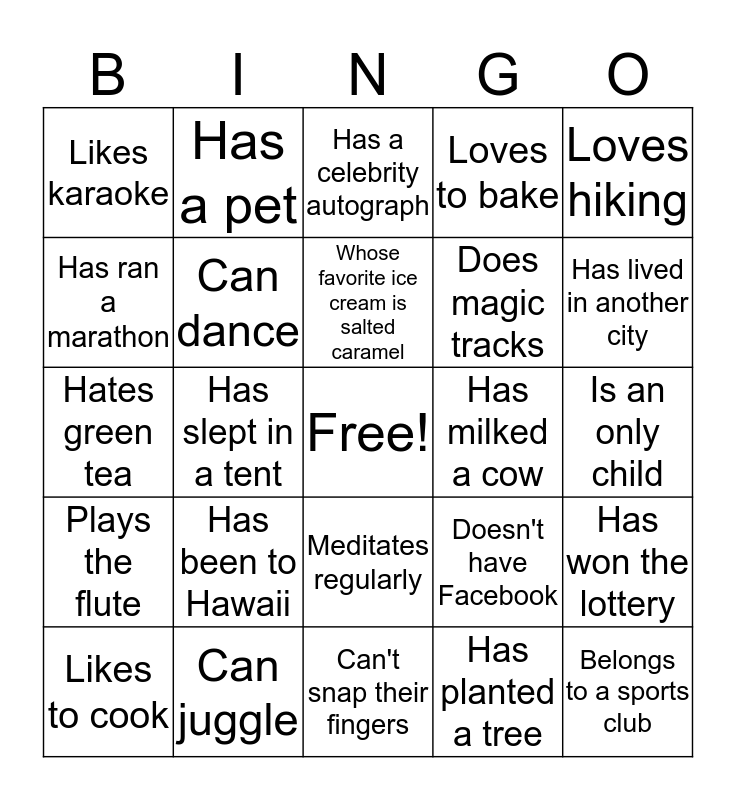 This bingo card has a free space and 24 words: Has been to Hawaii, Can juggle, Whose favorite ice cream is salted caramel, Likes to cook, Loves hiking, Likes karaoke, Has ran a marathon, Has a pet, Has milked a cow, Meditates regularly, Does magic tracks, Hates green tea, Doesn't have Facebook, Has won the lottery, Can dance, Has planted a tree, Is an only child, Has a celebrity autograph, Has lived in another city, Has slept in a tent, Belongs to a sports club, Plays the flute, Loves to bake and Can't snap their fingers.
