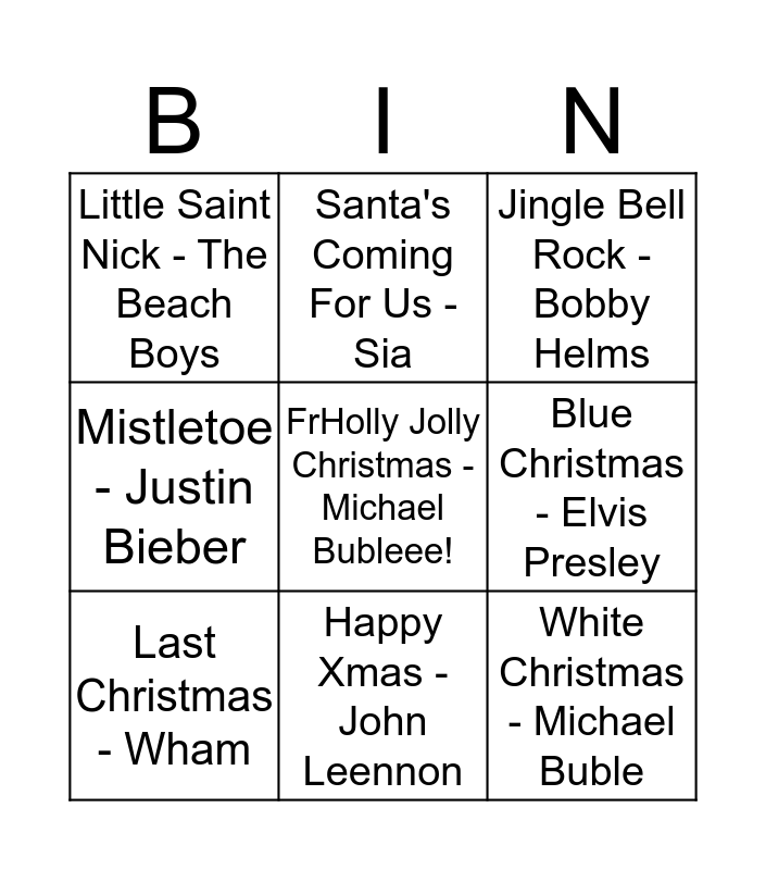 This bingo card has a free space and 32 words: Fairytale of New York - The Pogues, ts The Most Wonderful Time of the year - Andy Williams, Please Come Home For Christmas - Eagles, All I Want For Christmas Is You - Mariah Carey, Hallelujah - Pentatonix, Last Christmas - Wham, White Christmas - Michael Buble, Sleigh Ride - Miley Cyrus, Santa's Coming For Us - Sia, Rockin' Around the Christmas Treet - Brenda Lee, Happy Xmas - John Leennon, Jingle Bell Rock - Bobby Helms, Christmas (Baby Please Come Home) - Mariah Carey, Winter Wonderland - Michael Buble, Santa Clause is Coming to Town - Mariah Carey, Run Rudolph Run - Chuck Berry, Deck The Halls - Nat King Cole, Here Comes Santa Claus - Gene Aunty, Its Begining to Look alot like Christmas - Bing Crosby, et it Snow! - Frank Sinatra, You Make it Feel Like Christmas - Gwen Stefani, Blake Shelton, Santa Baby - Kylie Minogue, 8 Days of Christmas - Destinys Child, Santa Tell Me - Ariana Grande, Underneath The Tree - Kelly Clarkson, Mistletoe - Justin Bieber, Have Yourself a Merry Little Christmas - Sam Smith, Blue Christmas - Elvis Presley, Little Saint Nick - The Beach Boys, One More Sleep - Leona Lewis, Christmas Lights - Coldplay and Frosty the snowman - Michael Buble.