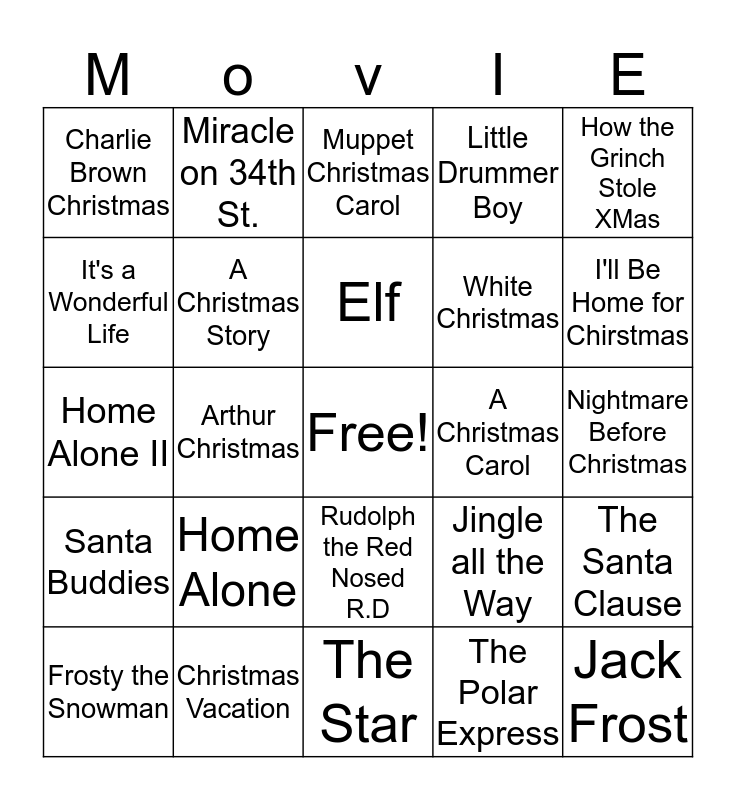 This bingo card has a free space and 24 words: Home Alone, Christmas Vacation, Elf, Frosty the Snowman, How the Grinch Stole XMas, Charlie Brown Christmas, It's a Wonderful Life, Miracle on 34th St., A Christmas Carol, Rudolph the Red Nosed R.D, White Christmas, Home Alone II, Jingle all the Way, The Santa Clause, A Christmas Story, The Polar Express, Nightmare Before Christmas, Muppet Christmas Carol, I'll Be Home for Chirstmas, Arthur Christmas, Jack Frost, Santa Buddies, Little Drummer Boy and The Star.