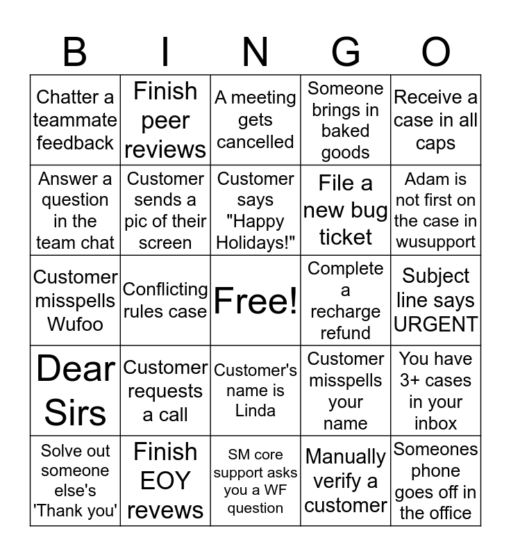 This bingo card has a free space and 24 words: Customer requests a call, Finish EOY revews, Customer says "Happy Holidays!", Solve out someone else's 'Thank you', Receive a case in all caps, Chatter a teammate feedback, Answer a question in the team chat, Finish peer reviews, Complete a recharge refund, Customer's name is Linda, File a new bug ticket, Customer misspells Wufoo, Customer misspells your name, You have 3+ cases in your inbox, Customer sends a pic of their screen, Manually verify a customer, Subject line says URGENT, A meeting gets cancelled, Adam is not first on the case in wusupport, Conflicting rules case, Someones phone goes off in the office, Dear Sirs, Someone brings in baked goods and SM core support asks you a WF question.