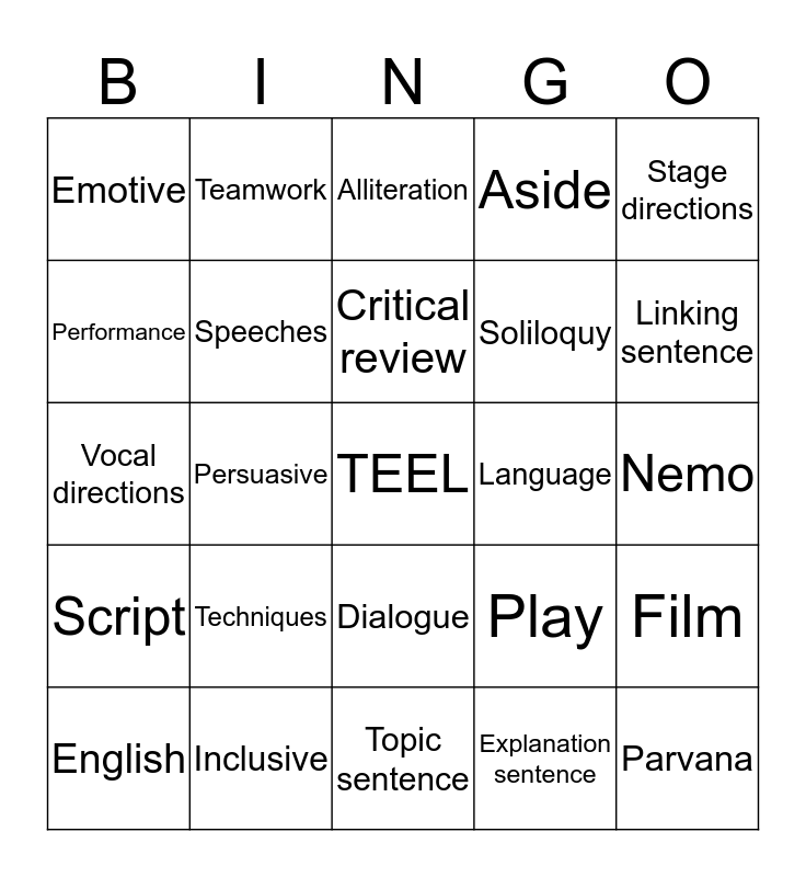 This bingo card has a free space and 29 words: English, Rule of 3, Persuasive, Film review, Emotive, Alliteration, Speeches, Techniques, Language, Inclusive, Nemo, Parvana, Topic sentence, Explanation sentence, Linking sentence, Evidence sentence, Dialogue, Script, Stage directions, Vocal directions, Play, Monologue, Soliloquy, Performance, Aside, Teamwork, Film, Critical review and Essay.