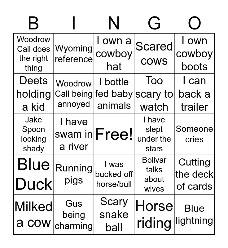 This bingo card has a free space and 34 words: Biscuits!, Horse riding, Gun shots, Hat Creek Sign, Blue Duck, Woodrow Call being annoyed, I own cowboy boots, Milked a cow, Wyoming reference, I know how to 2-step, I bottle fed baby animals, I own a cowboy hat, Lorena fixing her hair, Newt looking down at his feet, I have slept under the stars, I can back a trailer, Gus being charming, Jake Spoon looking shady, Running pigs, Bolivar talks about wives, I was bucked off horse/bull, July doing something dumb, Woodrow Call does the right thing, Someone cries, Scary snake ball, Blue lightning, Scared cows, Terrible stereotype, Too scary to watch, Deets holding a kid, I had two deserts tonight, I have swam in a river, Cutting the deck of cards and True love displayed.