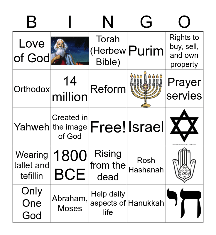 This bingo card has 5 images, a free space and 19 words: 1800 BCE, Abraham, Moses, Reform, Only One God, Rights to buy, sell, and own property, Love of God, Orthodox, Israel, Rising from the dead, Yahweh, Rosh Hashanah, 14 million, Hanukkah, Torah (Herbew Bible), Prayer servies, Created in the image of God, Wearing tallet and tefillin, Purim and Help daily aspects of life.