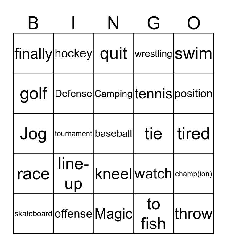This bingo card has a free space and 69 words: center, tired, soccer, fall-down, offense, challenge, wrestling, umpire, swim, cooperate, champ(ion), congratulate, finally, quit, jump, tournament, kneel, tennis, expert, race, tie, watch, position, touchdown, Ride-bike, snowboard, compete, exhausted, to fish, shout, hockey, lose (a game), popular, cheerleading, play-cards, addicted-to, dance, flock-to, golf, hike, line-up, throw, skiing, karate, switch, skateboard, team, talented, push, Defense, Camping, count, Ride-A-Horse, Magic, beat, Gymnastics, Fun, Inept, Audience, Jog, Slow, Enjoy, Play, Win, Skydive, Athlete, Kick, Game and Basketball.