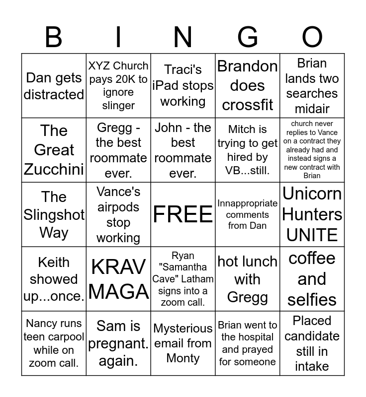 This bingo card has a free space and 24 words: KRAV MAGA, Sam is pregnant. again., John - the best roommate ever., Nancy runs teen carpool while on zoom call., Brian lands two searches midair, Dan gets distracted, The Great Zucchini, XYZ Church pays 20K to ignore slinger, Innappropriate comments from Dan, Ryan "Samantha Cave" Latham signs into a zoom call., Mitch is trying to get hired by VB...still., The Slingshot Way, hot lunch with Gregg, coffee and selfies, Gregg - the best roommate ever., Brian went to the hospital and prayed for someone, Unicorn Hunters UNITE, Traci's iPad stops working, church never replies to Vance on a contract they already had and instead signs a new contract with Brian, Vance's airpods stop working, Placed candidate still in intake, Keith showed up...once., Brandon does crossfit and Mysterious email from Monty.