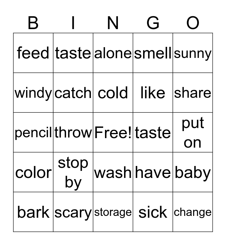 This bingo card has a free space and 29 words: bark, smell, throw, proud of, feed, alone, catch, stop by, taste, scary, put on, change, storage, sick, share, face, wash, color, sunny, pencil, have, weather, like, windy, smell, taste, baby, cold and ball.