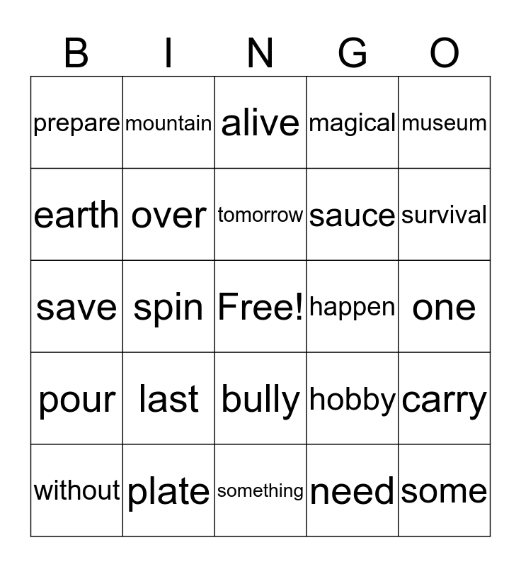This bingo card has a free space and 29 words: without, acually, spin, anything, prepare, alive, over, last, happen, plate, one, some, something, need, survival, potion, bully, pour, museum, save, hobby, mustard, sauce, earth, magical, mountain, carry, tomorrow and clean up.