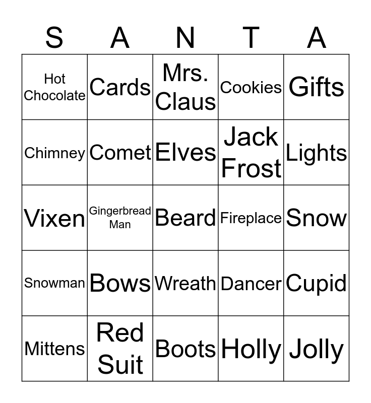 This bingo card has 51 words: Free!, Beard, Blitzen, Boots, Bows, Candy cane, Cards, Caroling, Chimney, Coal, Comet, Cookies, Cupid, Dancer, Dasher, Donner, Elves, Fireplace, Garland, Gifts, Gingerbread Man, Holly, Hot Chocolate, Jack Frost, Jingle Bells, Jolly, Lights, Mistletoe, Mittens, Mrs. Claus, North Pole, Ornament, Polar Bear, Prancer, Present, Red Suit, Reindeer, Ribbon, Rudolph, Sleigh, Snow, Snowman, St Nick, Stocking, Sugar Plum, Toys, Vixen, Workshop, Wrapping paper, Wreath and Yes, Virginia.