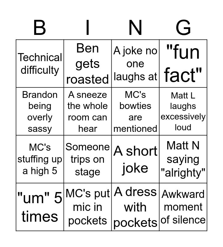 This bingo card has 20 words: Matt N saying "alrighty", "Look at all those chickens!", A joke no one laughs at, Photobooth gets mentioned for the 4th time, "um" 5 times, Brandon being overly sassy, MC's put mic in pockets, Technical difficulty, MC's stuffing up a high 5, Ben gets roasted, Someone trips on stage, A short joke, A sneeze the whole room can hear, Awkward moment of silence, MC's bowties are mentioned, Brandon sarcastic laughing, Matt L laughs excessively loud, "fun fact", A dress with pockets and a white suit.