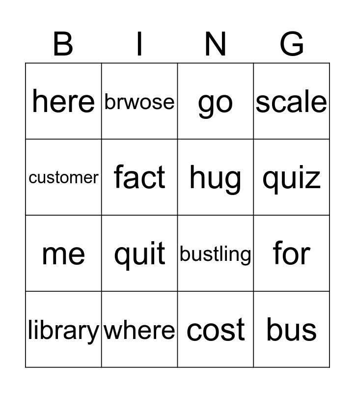 This bingo card has 16 words: where, for, go, here, me, brwose, bustling, cost, customer, fact, library, scale, quit, quiz, hug and bus.