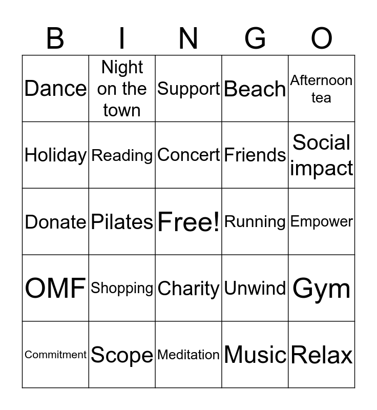 This bingo card has a free space and 48 words: Yoga, Relax, Spa day, Meditation, Shopping, Manicure, Night on the town, Fancy dinner, Holiday, Travel, Reading, Beach, Gym, Unwind, Salon, Grooming, Concert, Running, Coffee, Afternoon tea, Pilates, Music, Dance, Friends, One Million Futures, Social impact, Commitment, Get involved, Charity, OMF, 13 partners, London, Mind, The Prince’s Trust, Scope, Disability equality, Mental health, Empower, Employment, Education, Confidence, Young people, Support, Volunteer, Donate, Give, Social enterprise and Generosity.
