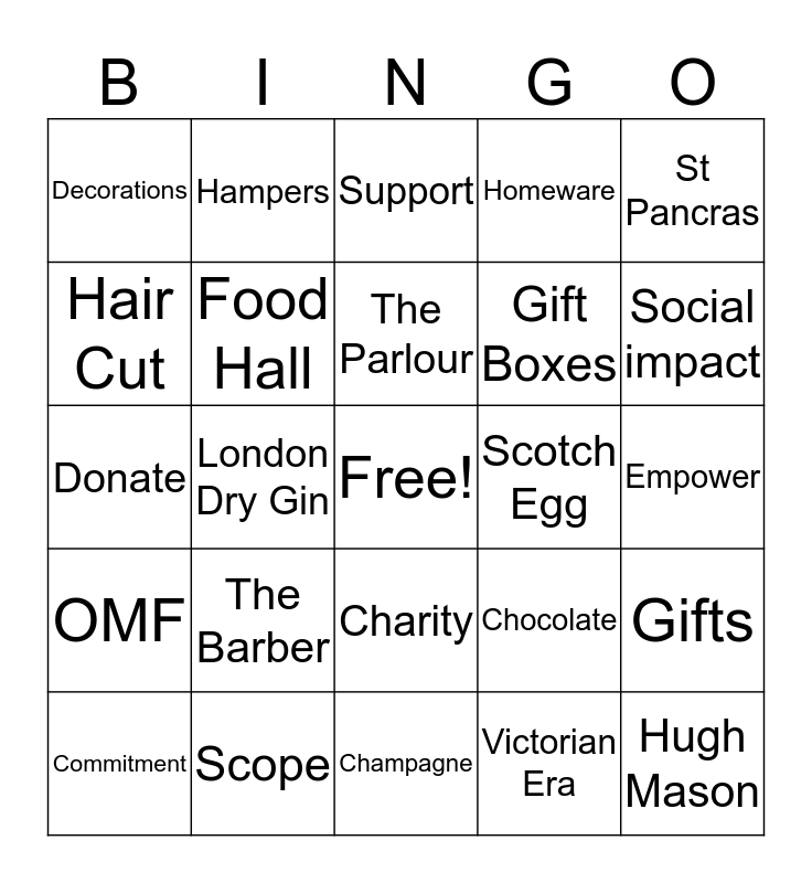 This bingo card has a free space and 48 words: William Fortnum, Hugh Mason, Afternoon Tea, Champagne, The Barber, Piccadilly, Hampers, Wet Shave, Hair Cut, Head Massage, Food Hall, Homeware, Gifts, Chocolate, The Gallery, The Wine Bar, The Parlour, Scotch Egg, Tea Salon, St Pancras, London Dry Gin, Victorian Era, Decorations, Gift Boxes, One Million Futures, Social impact, Commitment, Get involved, Charity, OMF, 13 partners, London, Mind, The Prince’s Trust, Scope, Disability equality, Mental health, Empower, Employment, Education, Confidence, Young people, Support, Volunteer, Donate, Give, Social enterprise and Generosity.