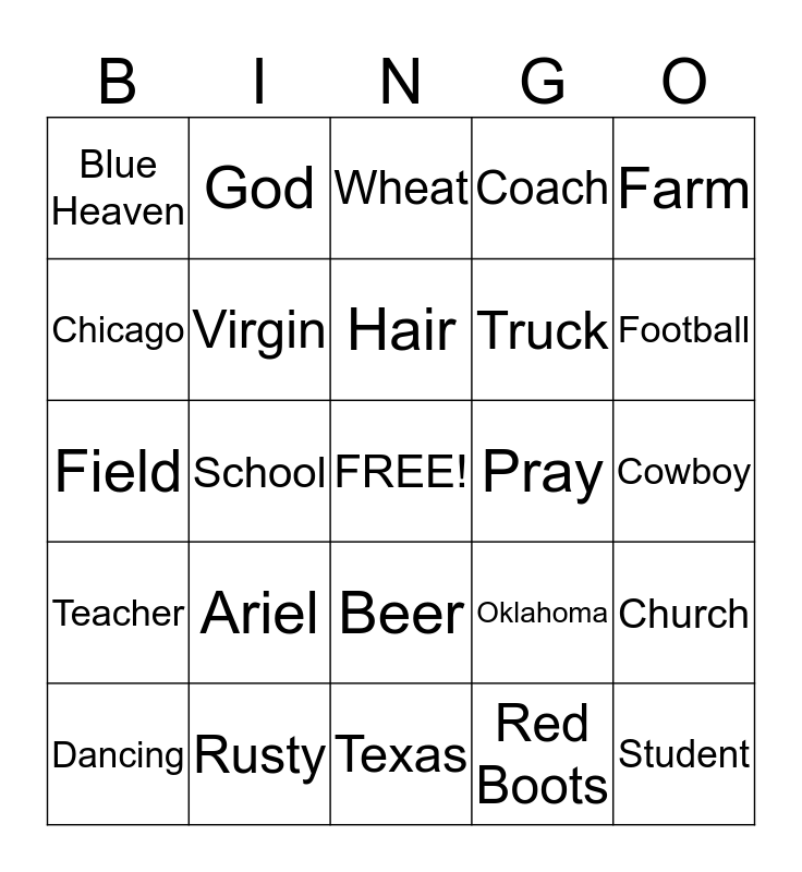 This bingo card has a free space and 24 words: Ariel, Rusty, Hair, Dancing, Farm, Blue Heaven, Chicago, God, Pray, Beer, Truck, Field, Oklahoma, Church, Virgin, Red Boots, Cowboy, Wheat, Football, School, Student, Teacher, Coach and Texas.