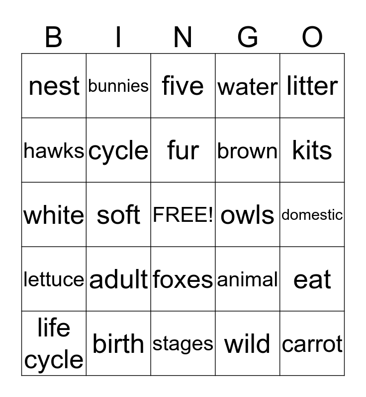 This bingo card has a free space and 24 words: adult, birth, fur, life cycle, litter, nest, hawks, bunnies, owls, foxes, brown, white, animal, eat, cycle, wild, domestic, five, kits, soft, carrot, lettuce, water and stages.