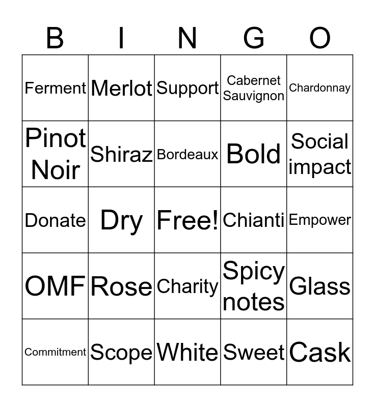 This bingo card has a free space and 48 words: Grapes, Cask, Red, White, Rose, Malbec, Merlot, Vintage, Pinot Noir, Pinot Griot, Shiraz, Cabernet Sauvignon, Glass, Spicy notes, Vineyard, Napa Valley, Bordeaux, Chianti, Riesling, Chardonnay, Dry, Sweet, Ferment, Bold, One Million Futures, Social impact, Commitment, Get involved, Charity, OMF, 13 partners, London, Mind, The Prince’s Trust, Scope, Disability equality, Mental health, Empower, Employment, Education, Confidence, Young people, Support, Volunteer, Donate, Give, Social enterprise and Generosity.