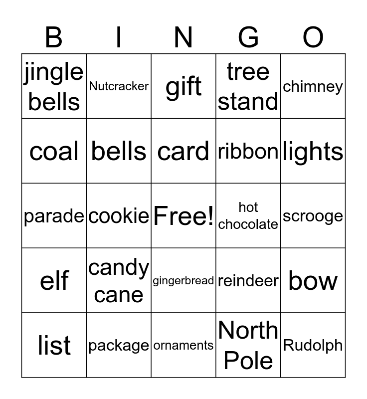 This bingo card has a free space and 37 words: shopping, sleigh, stocking, bells, bow, candy cane, card, carol, chimney, tree, cookie, tree stand, Rudolph, scrooge, coal, elf, Frosty, gift, gingerbread, hot chocolate, jingle bells, lights, list, ornaments, St.Nick, North Pole, Nutcracker, mistletoe, mittens, naughty, nice, package, parade, presents, reindeer, ribbon and Santa.