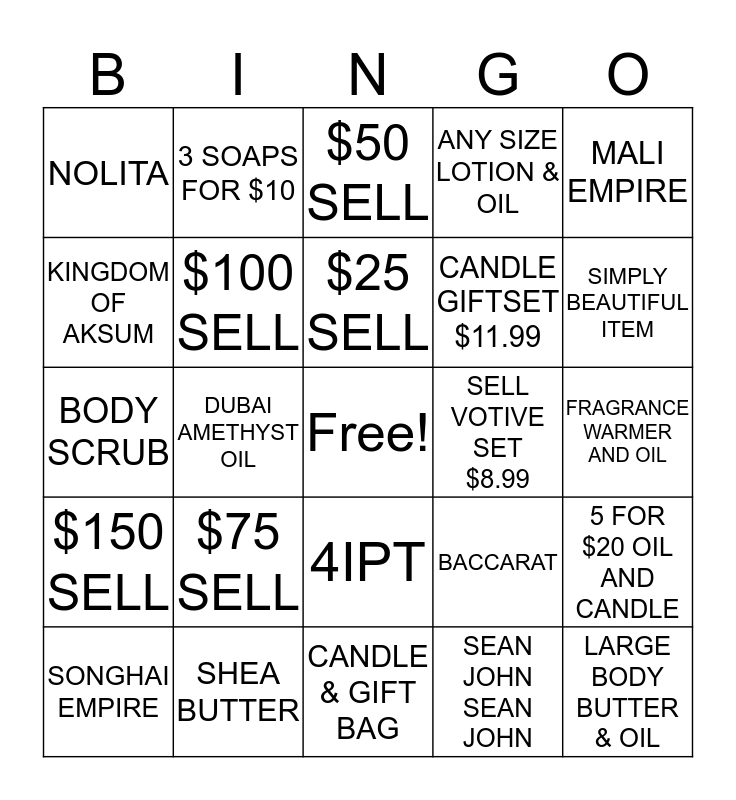 This bingo card has a free space and 24 words: $75 SELL, SHEA BUTTER, $25 SELL, SONGHAI EMPIRE, MALI EMPIRE, NOLITA, KINGDOM OF AKSUM, 3 SOAPS FOR $10, SELL VOTIVE SET $8.99, 4IPT, CANDLE GIFTSET $11.99, BODY SCRUB, BACCARAT, 5 FOR $20 OIL AND CANDLE, $100 SELL, SEAN JOHN SEAN JOHN, FRAGRANCE WARMER AND OIL, $50 SELL, SIMPLY BEAUTIFUL ITEM, DUBAI AMETHYST OIL, LARGE BODY BUTTER & OIL, $150 SELL, ANY SIZE LOTION & OIL and CANDLE & GIFT BAG.