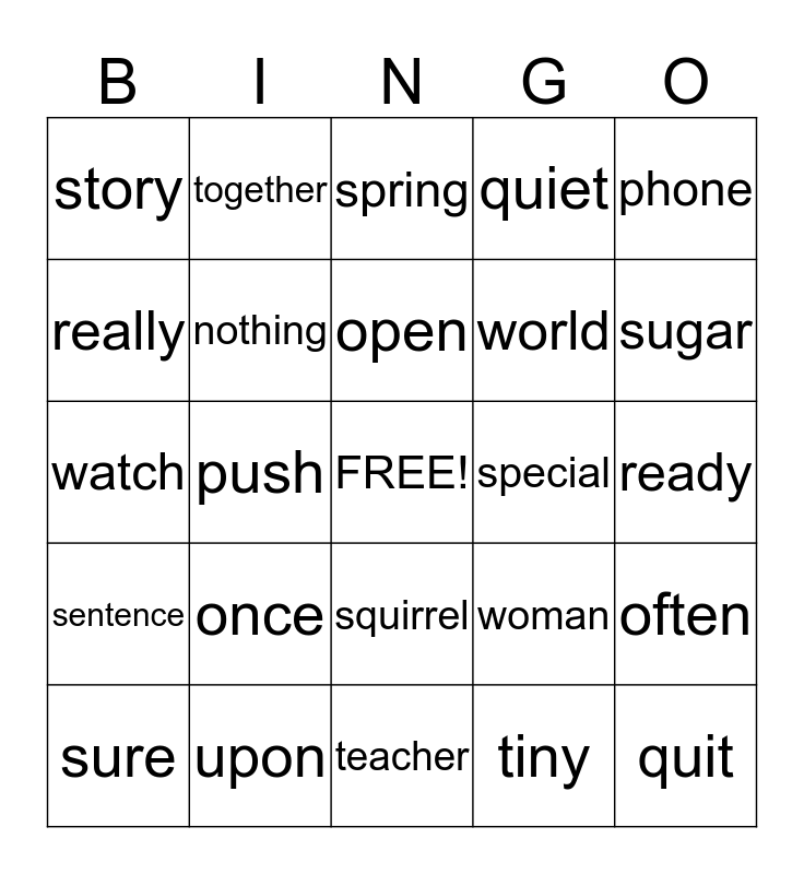 This bingo card has a free space and 37 words: neighbor, noise, noisy, nothing, often, once, open, page, phone, picture, push, quiet, quit, ready, really, sentence, shoe, spring, squirrel, special, story, sugar, sure, teacher, thought, tiny, together, tomorrow, tough, trouble, until, upon, watch, while, woman, world and young.