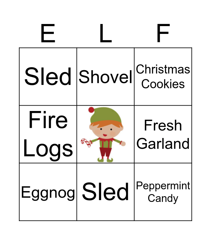This bingo card has a free space and 9 words: Eggnog, Christmas Cookies, Shovel, Fire Logs, Sled, Fresh Garland, Peppermint Candy, Chocolate Chips and Sled.