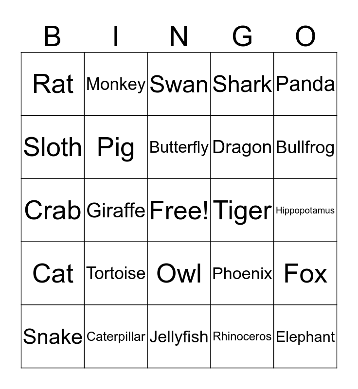 This bingo card has a free space and 24 words: Tortoise, Caterpillar, Butterfly, Snake, Panda, Rat, Sloth, Monkey, Tiger, Owl, Dragon, Crab, Phoenix, Fox, Pig, Rhinoceros, Hippopotamus, Swan, Bullfrog, Giraffe, Elephant, Cat, Shark and Jellyfish.