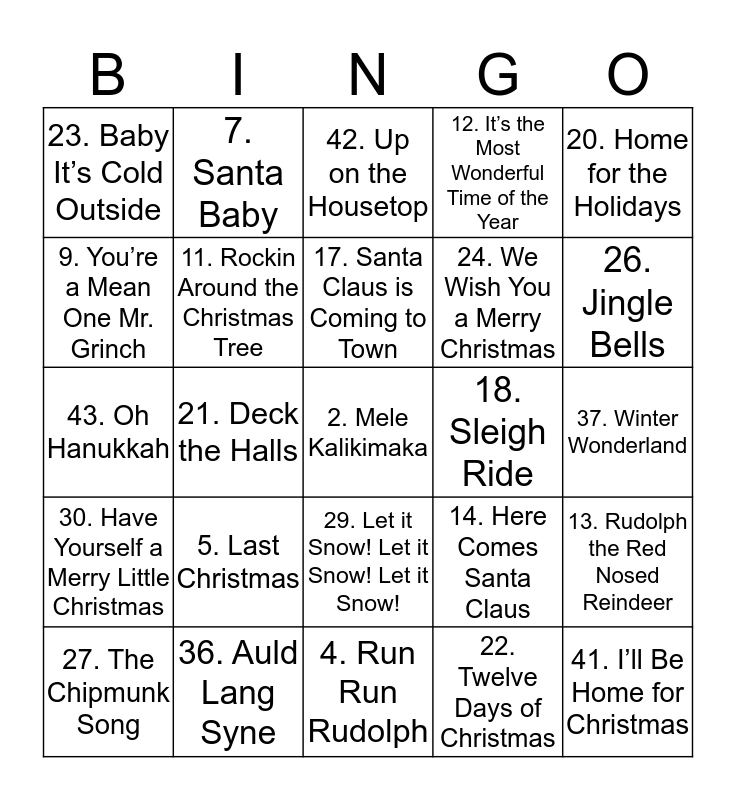 This bingo card has 47 words: 1. All I Want for Christmas is You, 2. Mele Kalikimaka, 3. I Want a Hippopotamus for Christmas, 4. Run Run Rudolph, 5. Last Christmas, 6. Feliz Navidad, 7. Santa Baby, 8. Jingle Bell Rock, 9. You’re a Mean One Mr. Grinch, 10. Grandma Got Run Over By a Reindeer, 11. Rockin Around the Christmas Tree, 12. It’s the Most Wonderful Time of the Year, 13. Rudolph the Red Nosed Reindeer, 14. Here Comes Santa Claus, 15. Blue Christmas, 16. White Christmas, 17. Santa Claus is Coming to Town, 18. Sleigh Ride, 19. I Saw Mommy Kissing Santa Claus, 20. Home for the Holidays, 21. Deck the Halls, 22. Twelve Days of Christmas, 23. Baby It’s Cold Outside, 24. We Wish You a Merry Christmas, 25. Holly Jolly Christmas, 26. Jingle Bells, 27. The Chipmunk Song, 28. It’s Beginning to Look a Lot like Christmas, 29. Let it Snow! Let it Snow! Let it Snow!, 30. Have Yourself a Merry Little Christmas, 31. Silent Night, 32. The First Noel, 33. Joy to the World, 34. The Little Drummer Boy, 35. Silver Bells, 36. Auld Lang Syne, 37. Winter Wonderland, 38. O, Christmas Tree, 39. Frosty the Snowman, 40. Carol of the Bells, 41. I’ll Be Home for Christmas, 42. Up on the Housetop, 43. Oh Hanukkah, 44. Jolly Old Saint Nicholas, 45. Chestnut Roasting on an Open Fire, 46. Toyland and 47. Little Saint Nick.