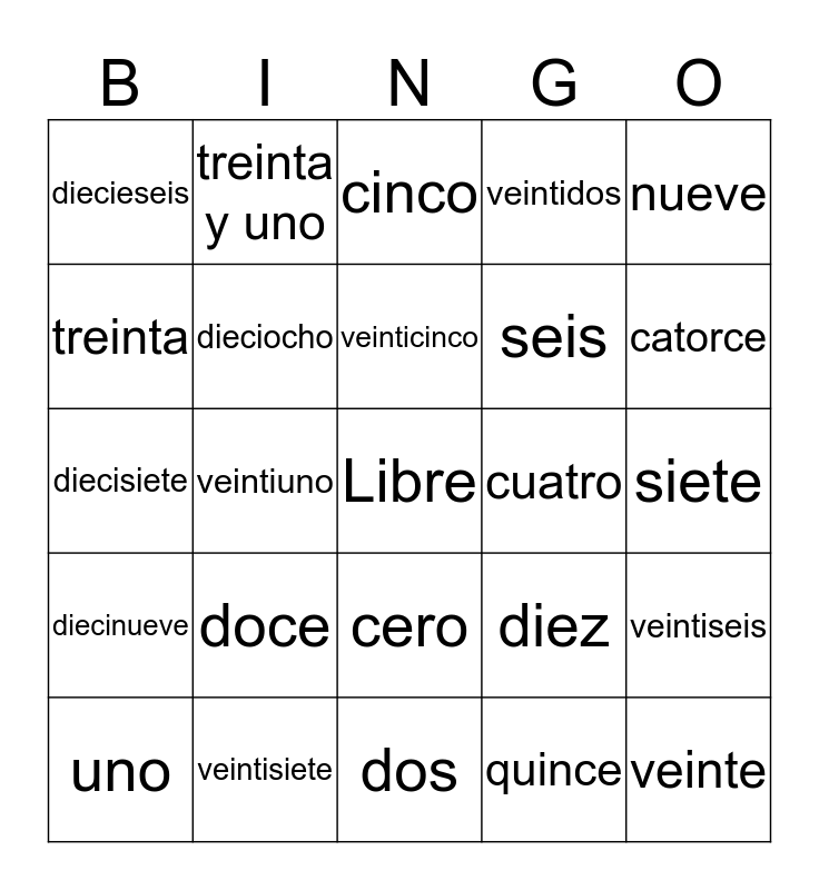 This bingo card has a free space and 29 words: uno, trece, veintiuno, ocho, diecieseis, cinco, dieciocho, doce, cuatro, veintisiete, siete, veinte, dos, quince, catorce, tres, cero, diecinueve, nueve, diecisiete, diez, veintiocho, seis, treinta, veintidos, treinta y uno, veintiseis, veinticinco and veinticuatro.