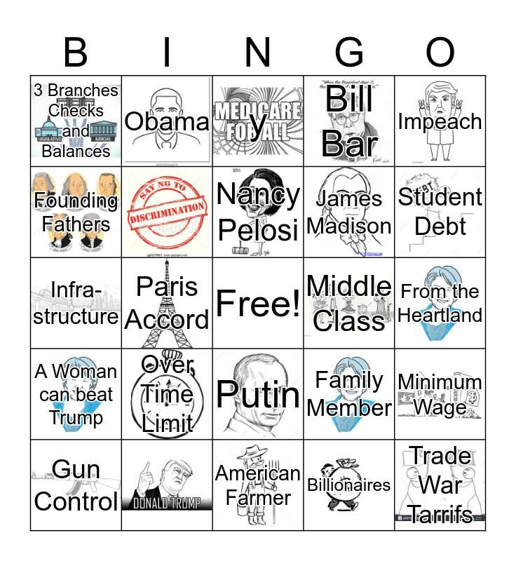 This bingo card has 34 images, a free space and 30 words: I think you have to earn Votes, Billionaires, AOC, A Woman can beat Trump, Impeach, Gun Control, Obama, Socialism, Nancy Pelosi, y, Green New Deal, Man Interrupts Woman, Middle Class, Student Debt, Infra-structure, Over Time Limit, Family Member, Putin, 3 Branches Checks and Balances, From the Heartland, American Farmer, Trade War Tarrifs, Bill Bar, Mention Candidate not on Stage, James Madison, Founding Fathers, NATO, Paris Accord, Minimum Wage and Mitch McConnell.