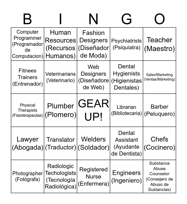 This bingo card has a free space and 28 words: Chefs (Cocinero), Cosmetologists (Cosmetólogas), Dental Hygienists (Higienistas Dentales), Engineers (Ingeniero), Fitnees Trainers (Entrenador), Fashion Designers (Diseñador de Moda), Human Resources (Recursos Humanos), Lawyer (Abogada), Librarian (Bibliotecaria), Photographer (Fotógrafa), Physical Therapists (Fisioterapeutas), Psychiatrists (Psiquiatra), Radiologic Techologists (Tecnología Radiológica), Registered Nurse (Enfermera), Sales/Marketing (Ventas/Márketing), Social Scientist (Científico Social), Translator (Traductor), Veterinarians (Veterinario), Web Designers (Diseñadore de Web), Welders (Soldador), Computer Programmer (Programador de Computacion), Probation Officer (Agente de Libertad Condicional), Substance Abuse Counselor (Consejero de Abuso de Sustancias), Plumber (Plomero), Barber (Peluquero), Dental Assistant (Ayudante de Dentista), Teacher (Maestro) and Mechanic (Mecánico).