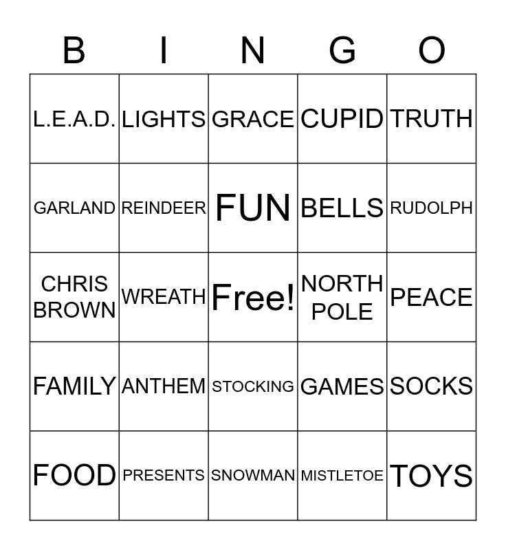 This bingo card has a free space and 34 words: CHRISTMAS, ELF, SANTA, SILENT NIGHT, PEACE, GARLAND, REINDEER, SNOWMAN, BELLS, TOYS, CHRIS BROWN, LIGHTS, MISTLETOE, COAL, FAMILY, WREATH, STOCKING, NORTH POLE, SOCKS, FOOD, PRESENTS, MERRY, CUPID, RUDOLPH, BEYONCE, ANTHEM, GRACE, ROYALTY, TRUTH, L.E.A.D., LOVE, FUN, GAMES and WORK.