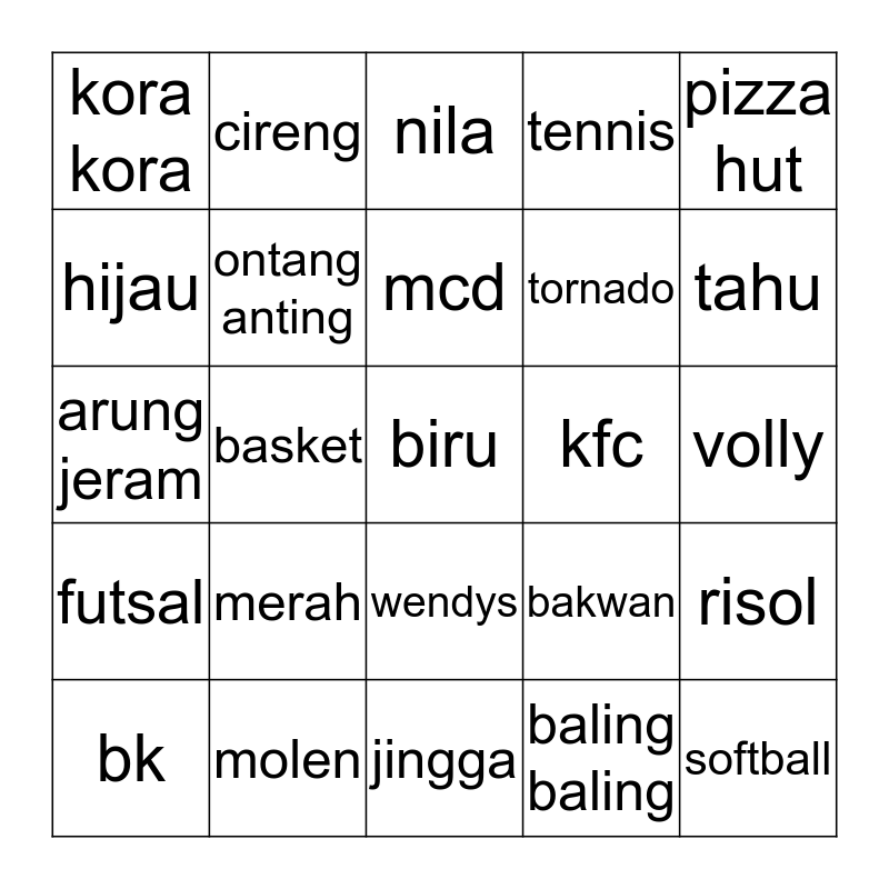 This bingo card has a free space and 24 words: merah, molen, mcd, bk, pizza hut, kora kora, hijau, cireng, kfc, wendys, tornado, arung jeram, bakwan, risol, ontang anting, baling baling, volly, nila, tahu, basket, softball, futsal, tennis and jingga.