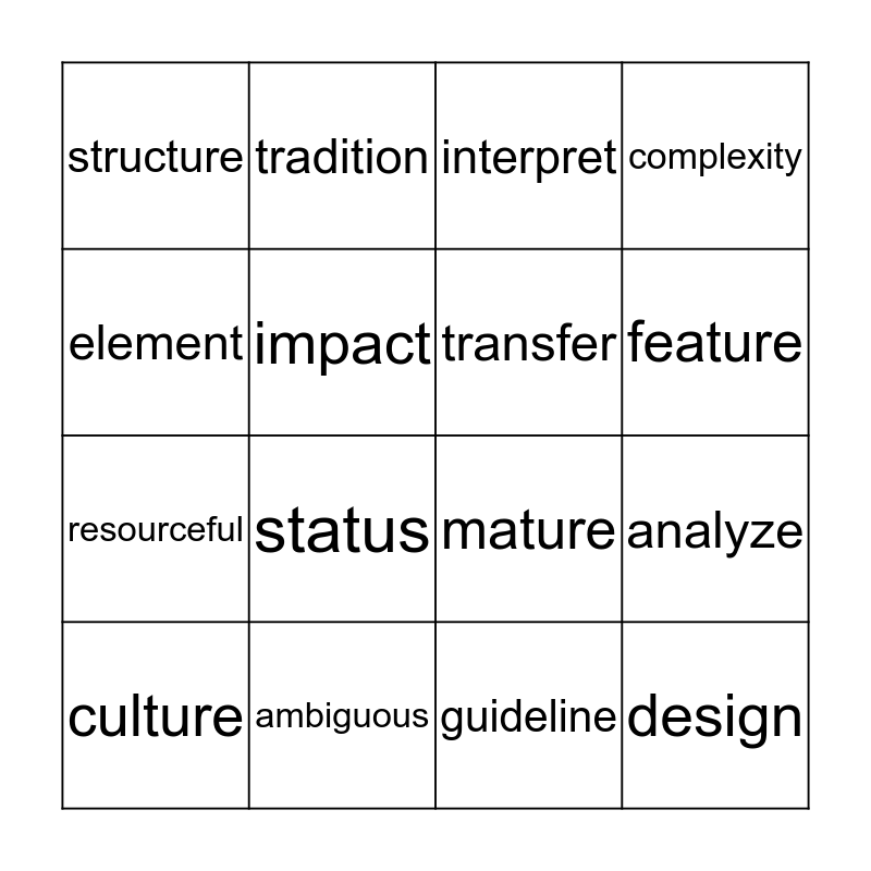 This bingo card has 16 words: ambiguous, analyze, interpret, structure, resourceful, tradition, mature, guideline, element, impact, culture, complexity, status, feature, transfer and design.