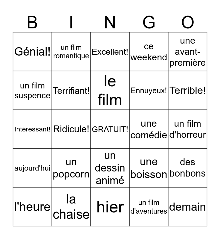This bingo card has a free space and 24 words: un popcorn, la chaise, le film, l'heure, une avant-première, Génial!, un film suspence, un flim romantique, une comédie, un dessin animé, Ennuyeux!, Intéressant!, une boisson, des bonbons, Terrifiant!, un film d'aventures, un film d'horreur, Excellent!, Terrible!, Ridicule!, demain, aujourd'hui, ce weekend and hier.