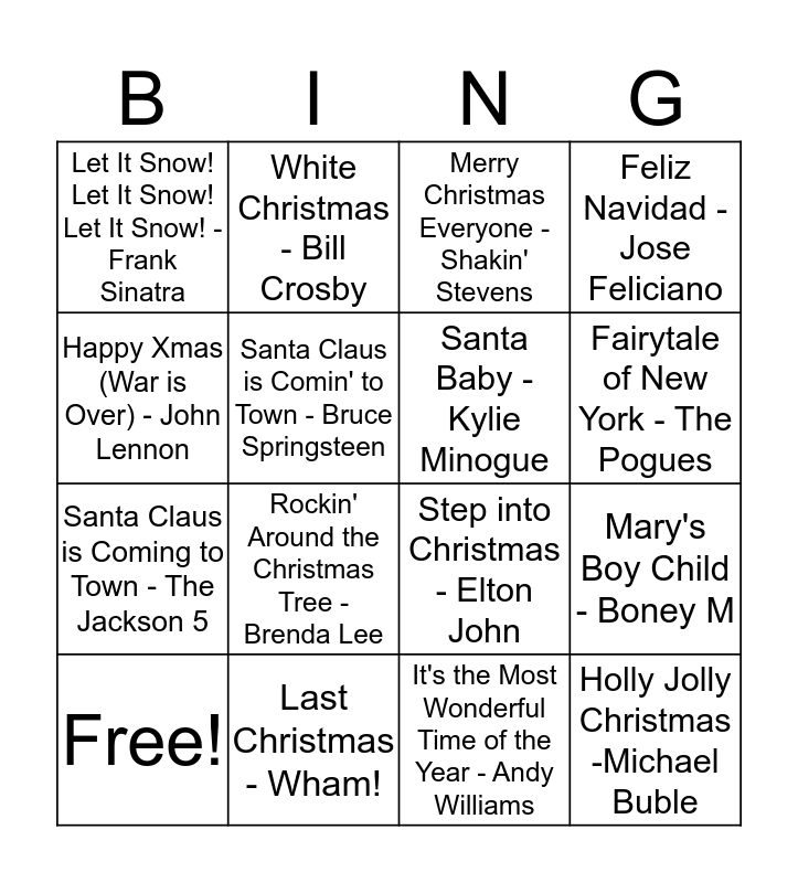 This bingo card has 24 words: Free!, All I Want for Christmas is You - Mariah Carey, Last Christmas - Wham!, It's the Most Wonderful Time of the Year - Andy Williams, Feliz Navidad - Jose Feliciano, Let It Snow! Let It Snow! Let It Snow! - Frank Sinatra, Santa Claus is Comin' to Town - Bruce Springsteen, Merry Christmas Everyone - Shakin' Stevens, Mary's Boy Child - Boney M, Underneath the Tree - Kelly Clarkson, Blue Christmas- Elvis, Santa Baby - Kylie Minogue, Jingle Bell Rock, It's Beginning to Look a Lot Like Christmas - Michael Buble, Rockin' Around the Christmas Tree - Brenda Lee, Driving Home from Christmas - Chris Rae, Holly Jolly Christmas -Michael Buble, Happy Xmas (War is Over) - John Lennon, Baby it's Cold Outside, Step into Christmas - Elton John, Fairytale of New York - The Pogues, Santa Claus is Coming to Town - The Jackson 5, White Christmas - Bill Crosby and I Saw Mommy Kissing Santa Claus - The Jackson 5.