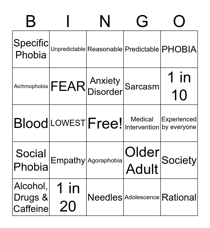 This bingo card has a free space and 29 words: Alcohol, Drugs & Caffeine, Aracnophobia, LOWEST, Hemophobia, Specific Phobia, Reasonable, FEAR, Empathy, Medical Intervention, 1 in 20, Experienced by everyone, Rational, Needles, Adolescence, 1 in 10, HIGHEST, Agoraphobia, Social Phobia, PHOBIA, Blood, Older Adult, Anemia, Sarcasm, Aichmophobia, Predictable, Unpredictable, Society, Anxiety Disorder and CBT.