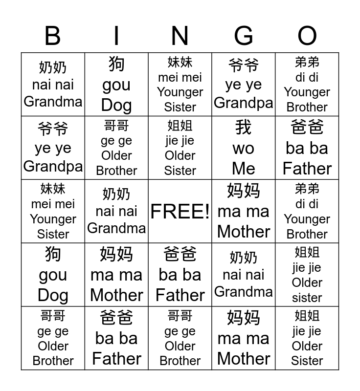 This bingo card has a free space and 24 words: 妈妈 ma ma Mother, 爸爸 ba ba Father, 姐姐 jie jie Older Sister, 哥哥 ge ge Older Brother, 弟弟 di di Younger Brother, 奶奶 nai nai Grandma, 爷爷 ye ye Grandpa, 狗 gou Dog, 妈妈 ma ma Mother, 爸爸 ba ba Father, 我 wo Me, 妹妹 mei mei Younger Sister, 奶奶 nai nai Grandma, 姐姐 jie jie Older sister, 哥哥 ge ge Older Brother, 妈妈 ma ma Mother, 弟弟 di di Younger Brother, 妹妹 mei mei Younger Sister, 爸爸 ba ba Father, 奶奶 nai nai Grandma, 姐姐 jie jie Older Sister, 狗 gou Dog, 爷爷 ye ye Grandpa and 哥哥 ge ge Older Brother.