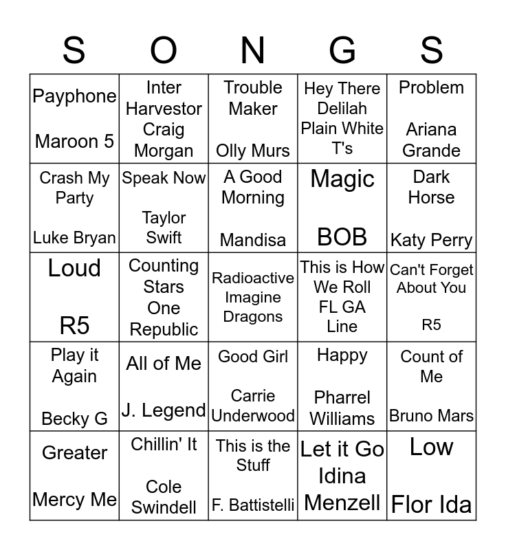 This bingo card has 25 words: All of Me J. Legend, This is the Stuff F. Battistelli, A Good Morning Mandisa, Greater Mercy Me, Problem Ariana Grande, Payphone Maroon 5, Crash My Party Luke Bryan, Inter Harvestor Craig Morgan, This is How We Roll FL GA Line, Good Girl Carrie Underwood, Magic BOB, Loud R5, Happy Pharrel Williams, Count of Me Bruno Mars, Speak Now Taylor Swift, Low Flor Ida, Can't Forget About You R5, Trouble Maker Olly Murs, Dark Horse Katy Perry, Counting Stars One Republic, Radioactive Imagine Dragons, Chillin' It Cole Swindell, Play it Again Becky G, Hey There Delilah Plain White T's and Let it Go Idina Menzell.