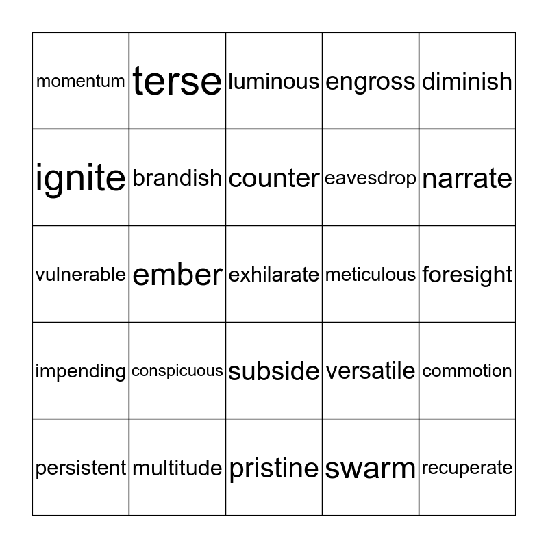 This bingo card has 38 words: vigilant, waft, weather, brandish, commotion, conspicuous, counter, debris, diminish, eavesdrop, ember, engross, exhilarate, foresight, ignite, impending, kindle, luminous, materialize, meticulous, momentum, multitude, narrate, persistent, potential, pristine, recuperate, repugnant, sabotage, scurry, specimen, subside, swarm, terse, uncanny, versatile, vulnerable and waver.