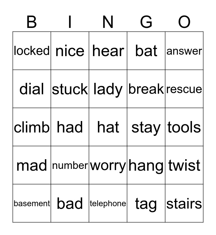 This bingo card has 25 words: number, telephone, lady, basement, answer, locked, dial, nice, stay, worry, break, climb, hang, twist, stuck, stairs, tools, hear, rescue, had, hat, bad, mad, bat and tag.
