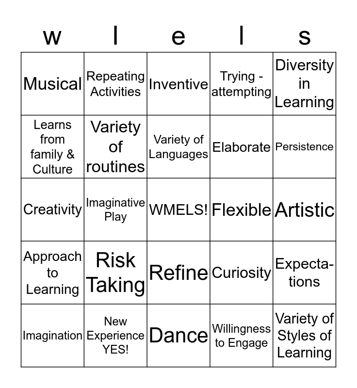 This bingo card has a free space and 24 words: Risk Taking, New Experience YES!, Variety of Languages, Imagination, Diversity in Learning, Musical, Learns from family & Culture, Repeating Activities, Flexible, Refine, Elaborate, Creativity, Curiosity, Expecta-tions, Variety of routines, Willingness to Engage, Artistic, Inventive, Persistence, Imaginative Play, Variety of Styles of Learning, Approach to Learning, Trying -attempting and Dance.