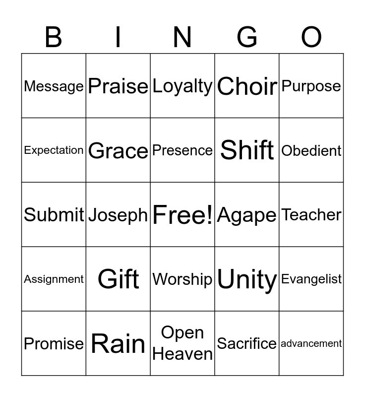 This bingo card has a free space and 44 words: Season, advancement, Spirit, Promise, Cycles, Sacrifice, Loyalty, Committed, Purpose, Rain, Choir, Agape, Worship, Gift, Jesus, Open Heaven, Message, Submit, Blessing, Obedient, Praise, Redeemer, Honor, Message, Covenant, Teacher, Pastor, Peace, Unity, Assignment, Access, Evangelist, New Beginning, Scripture, Joseph, Jeremiah, Abraham, Living Water, Presence, Expectation, Shift, Increase, Grace and Momentum.
