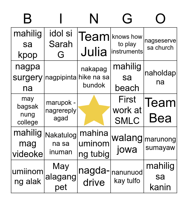 This bingo card has a free space and 24 words: Nakatulog na sa inuman, May alagang pet, nakapag hike na sa bundok, umiinom ng alak, nagseserve sa church, mahilig sa kpop, nagpa surgery na, idol si Sarah G, First work at SMLC, mahina uminom ng tubig, mahilig sa beach, may bagsak nung college, walang jowa, marunong sumayaw, nagpipinta, nanunuod kay tulfo, Team Bea, Team Julia, naholdap na, marupok - nagrereply agad, mahilig sa kanin, mahilig mag videoke, knows how to play instruments and nagda-drive.