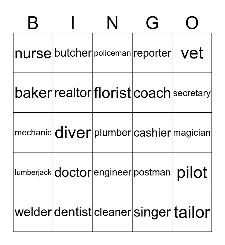This bingo card has a free space and 24 words: doctor, dentist, florist, welder, vet, nurse, baker, butcher, cashier, engineer, coach, mechanic, postman, pilot, realtor, singer, magician, policeman, secretary, diver, tailor, lumberjack, reporter and cleaner.