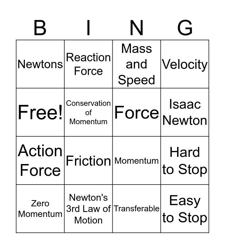This bingo card has 16 words: Newton's 3rd Law of Motion, Hard to Stop, Mass and Speed, Newtons, Action Force, Reaction Force, Momentum, Transferable, Free!, Conservation of Momentum, Zero Momentum, Velocity, Friction, Isaac Newton, Force and Easy to Stop.