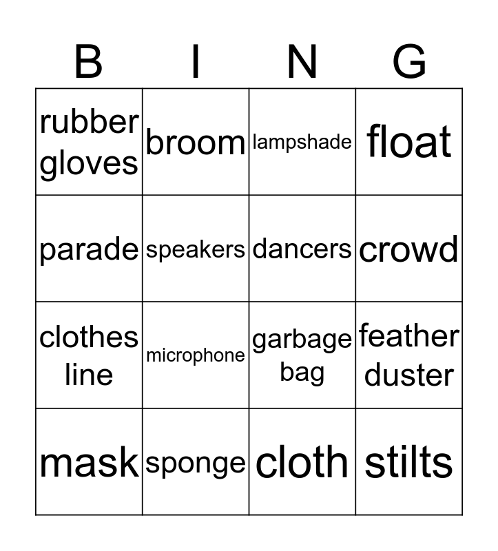 This bingo card has 16 words: sponge, feather duster, lampshade, rubber gloves, clothes line, broom, garbage bag, cloth, parade, speakers, mask, float, microphone, crowd, dancers and stilts.