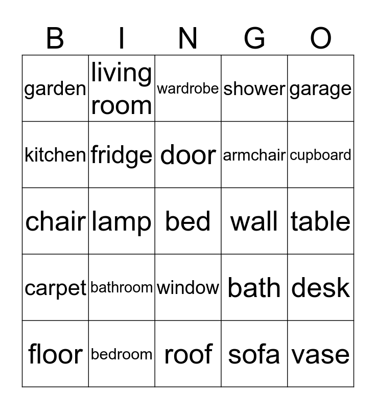 This bingo card has a free space and 24 words: bathroom, bedroom, door, floor, garage, garden, kitchen, living room, wall, window, armchair, chair, bath, desk, fridge, sofa, table, wardrobe, cupboard, lamp, vase, carpet, shower and roof.