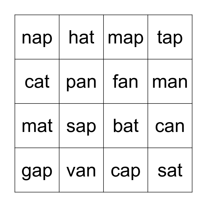 This bingo card has 17 words: cap, gap, map, nap, sap, tap, can, fan, man, pan, van, bat, cat, hat, mat, rat and sat.