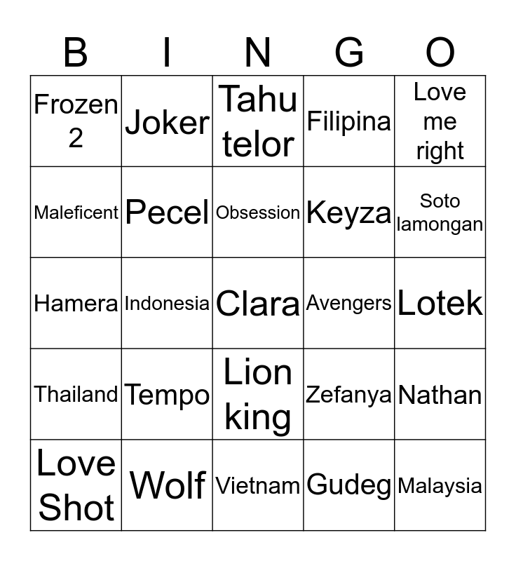 This bingo card has a free space and 24 words: Tempo, Wolf, Obsession, Love Shot, Love me right, Frozen 2, Maleficent, Joker, Avengers, Lion king, Keyza, Hamera, Zefanya, Nathan, Pecel, Gudeg, Lotek, Tahu telor, Soto lamongan, Indonesia, Malaysia, Thailand, Filipina and Vietnam.