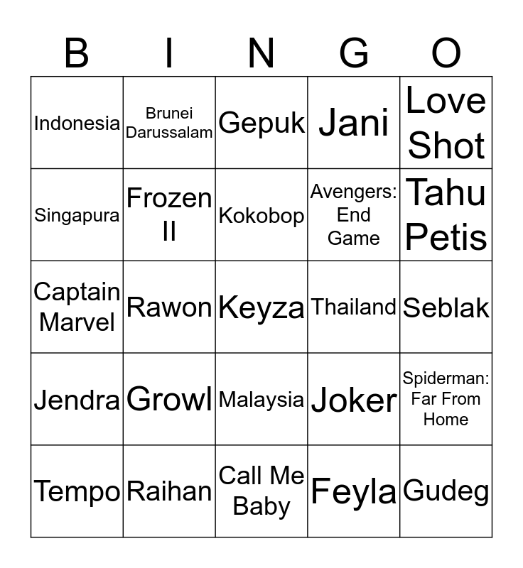 This bingo card has 25 words: Growl, Call Me Baby, Kokobop, Tempo, Love Shot, Indonesia, Singapura, Brunei Darussalam, Thailand, Malaysia, Avengers: End Game, Captain Marvel, Joker, Spiderman: Far From Home, Frozen II, Gudeg, Seblak, Gepuk, Tahu Petis, Rawon, Keyza, Raihan, Jendra, Jani and Feyla.