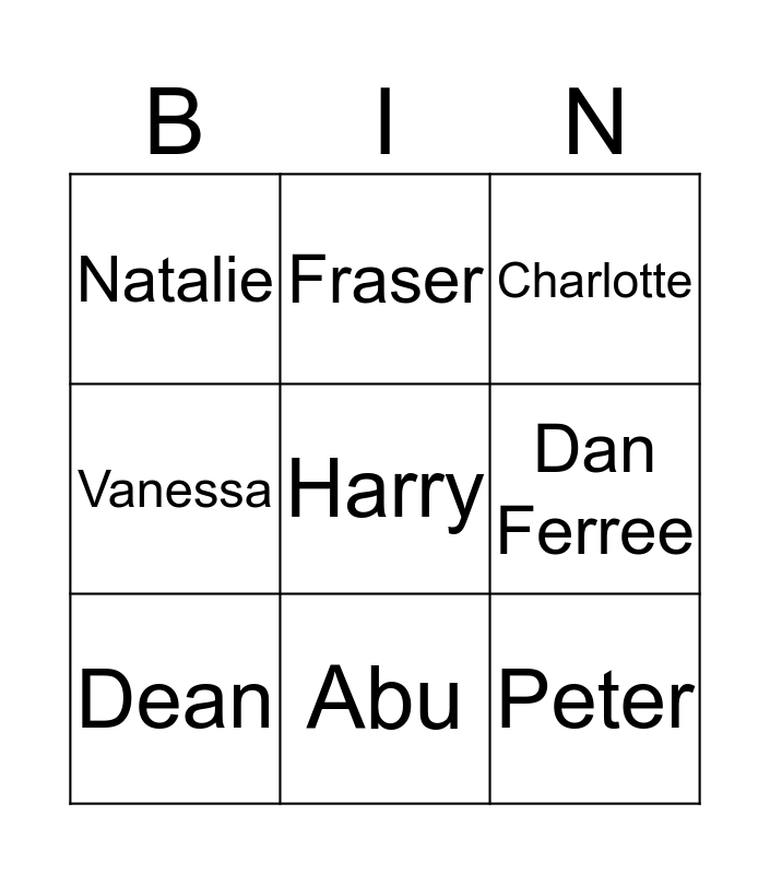 This bingo card has 9 words: Dean, Charlotte, Fraser, Vanessa, Natalie, Dan Ferree, Harry, Peter and Abu.